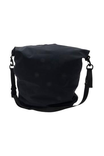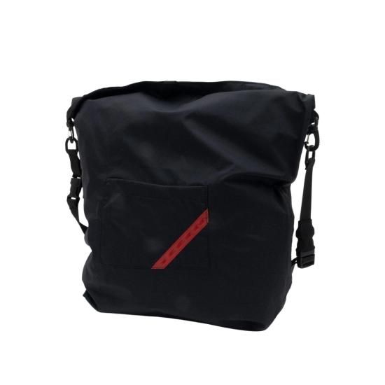 アウトドアウェアなどで使用される軽量な3レイヤー素材を使用し、裏を総シームテープで仕上げた完全防水のエコバッグです。小さくたたんで、丸めて、付属のストラップで傘の様に留め、綺麗に丸めてウエストのベルトループ等に取り付けすることでフリーハンドでも急な持ち運びに対応する事ができます。