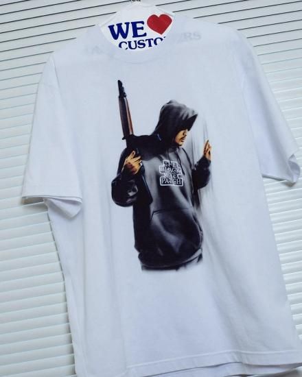 90 年代前半の黒人解放運動の指導者の生涯を描いた名作映画のワンシーンをブランド流儀に表現した Tシャツ。アートワークを手掛けたのはイラストレーター・ペインターの Takuya Kamioka