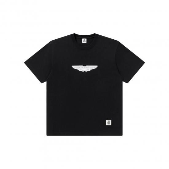 イギリスのラグジュアリースポーツカーメーカーのロゴをサンプリングしたグラフィックをプリントしたTシャツ。