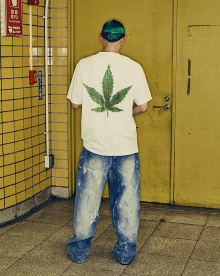 "SMALL OG LABEL" のロゴワッペンのサイドにピースマークやリーフの刺繍を施し、背面にはモザイクをかけたリーフモチーフのグラフィックをプリントした T シャツ。ボディは 8.5oz。プリントはシルクスクリーンプリント。