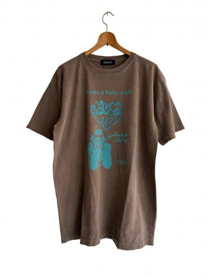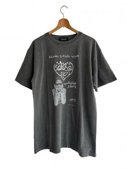 某「盲目の天才」アーティストの当時のライブフライヤーのデザインを英語表記を全てアラビア語に変更(エジプト人のグラフィックデザイナーと共作なのでアラビア語の翻訳はネイティブ、アラビア語フォントも拘って選定しています)し、ハート型のグラフィックにはラメプリントを採用。その他は手掠れプリントで経年変化を表現。ボディは経年変化を感じられるビンテージライクなダメージ加工と柔軟仕上げを施し、オリジナルカラーに染め上げました。