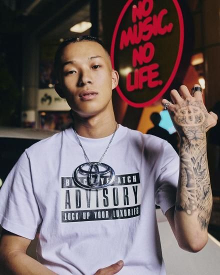 全米レコード協会(RIAA)によるペアレンタル・アドバイザリーのラベルにブランド名やメッセージをサンプリングしたグラフィックをプリントした T シャツ。裾にブランド純正商品であることを示すネームが付く。