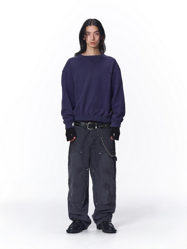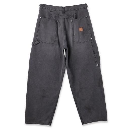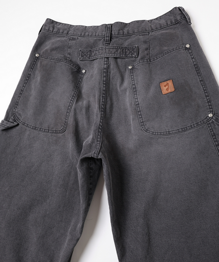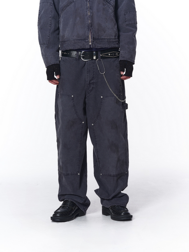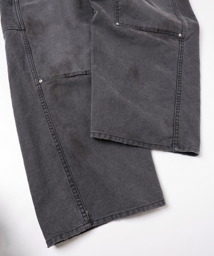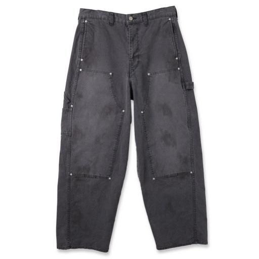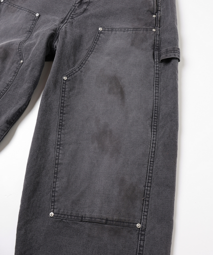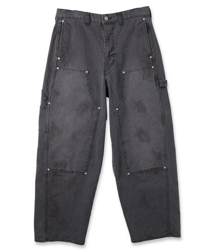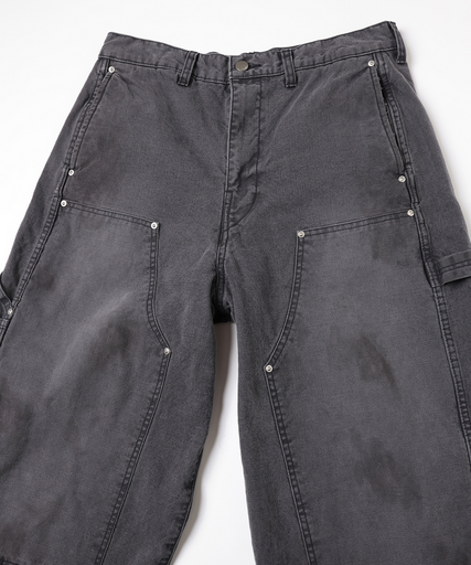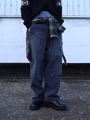 ダック生地を使用した、ダブルニーパンツ。太めで、股上を深めに設定した、ゆったりとしたシルエットの一本。ダブルニー、ツールポケット、ハンマーループ、ダブルステッチといったワークウェアで見られるディテールを入れ、フロントや後ポケットなどに打たれたリベットがデザインのアクセントになっております。生地には耐久性が非常に高い、中肉厚なダック生地を使用。タフな生地感にユーズド加工を施し、汚しの加工やポケット口、裾などにダメージ加工を施しております。