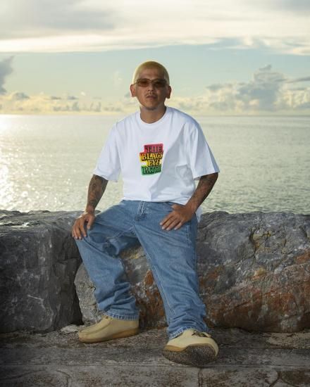 "OG LABEL" ロゴをレッド、イエロー、グリーンのラスタカラーで表現した T シャツ。