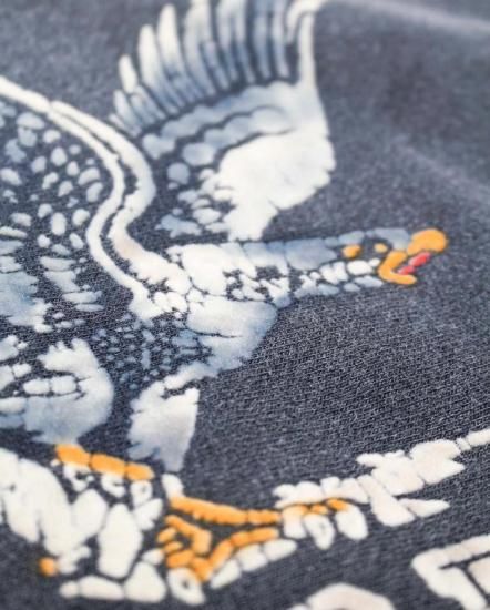 US AIR FORCEで特に人気の高いイーグル柄をモチーフに、1950年代に存在した植毛フロッキープリント技術を用いて再現したスペシャルな一枚。希少性の高いブラックボディに施されたプリントは、当時の雰囲気を色濃く宿す。さらに、アメリカで実際に着用され日焼けしたかのようなフェード感を表現し、ヴィンテージさながらの迫力とリアリティを纏った逸品。