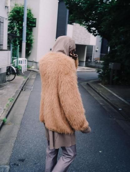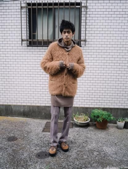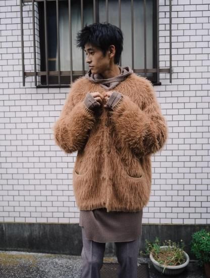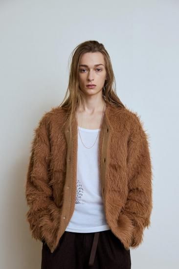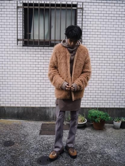 コットン、化繊がミックスされた毛足の長いフェザー糸を使用しています。動物の毛並みのような柔らかさ、軽さが特徴的。下糸にコットンにすることで安定した、しっかりとした着心地になります。