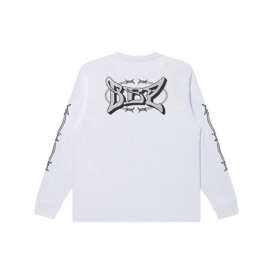 90 年代に人気を博したアメリカのモトクロスウェアのブランドロゴをサンプリングした "BEP" のグラフィックを左胸、バックにグリッタープリントでラメを表現し、両袖に有刺鉄線のグラフィックをプリントしたロングスリーブ T シャツ。裾に純正商品であることを示すネームが付く。