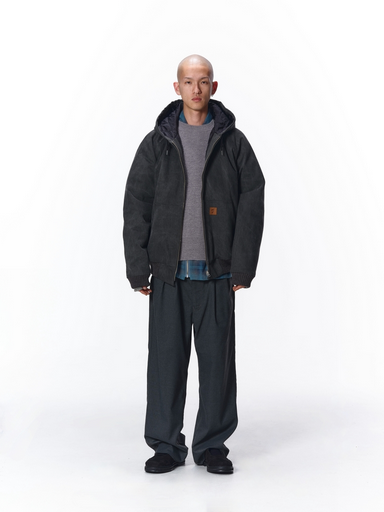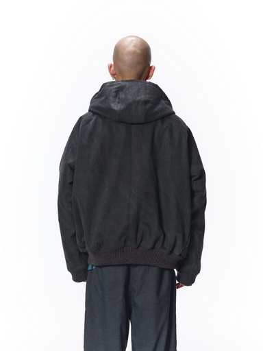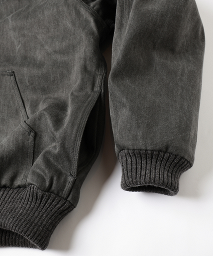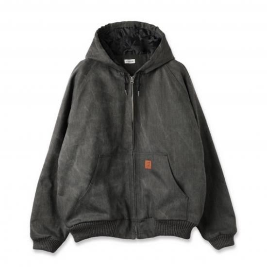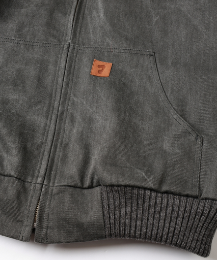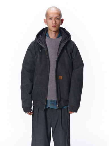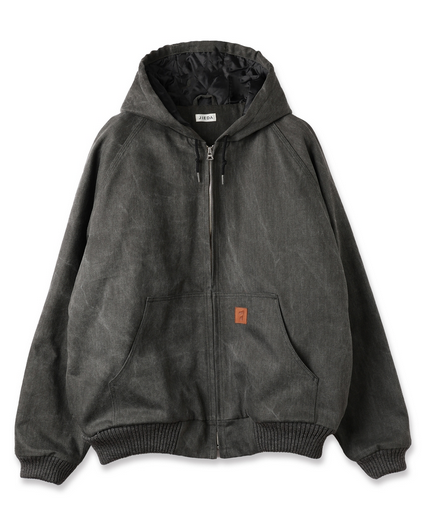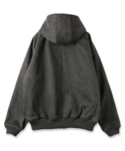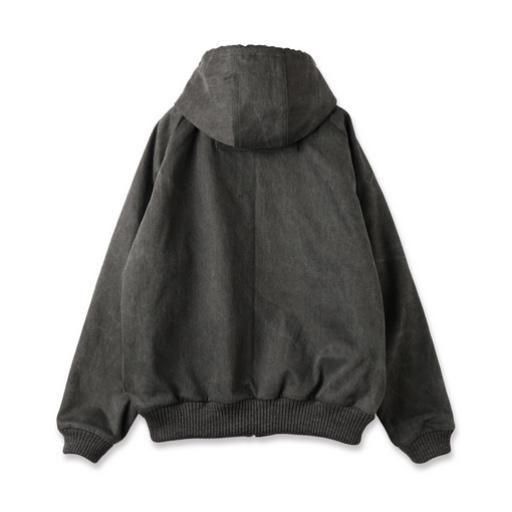 ヴィンテージのような風合いのフードジャケット。袖先と裾の肉厚ニットリブが外気の侵入を防ぎ、裏地はキルティング仕様となっており保温性に長けた1着となっております。フロントには大きめのハンドポケット、オリジナルレザーパッチがさりげないアクセントとなっています。生地には、顔料コーティングに洗いを施したカツラギ生地を使用。 生地の段階で洗いを入れることで独特なユーズド感のある風合いとなっております。 またウール素材を裏地に使用することで高い保温性も魅力の一つとなっております。