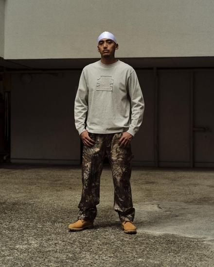 "OG LABEL" ロゴ刺繍のアップリケを縫い付け、バイオウォッシュ加工を施したロングスリーブ T シャツ。 ボディは度詰天竺の 11oz。