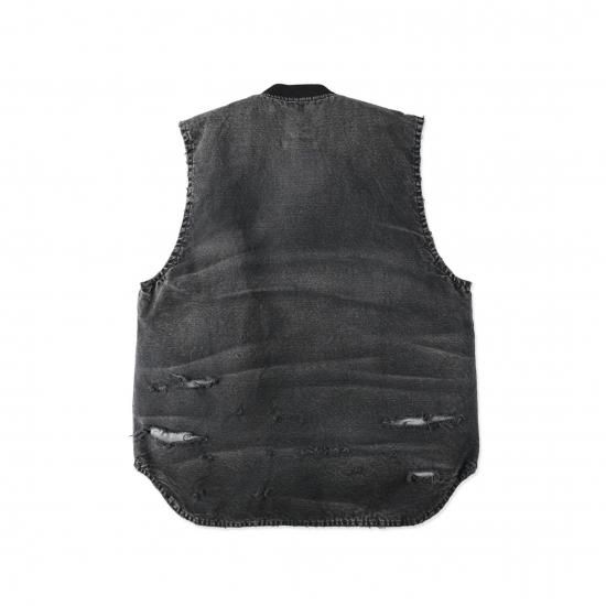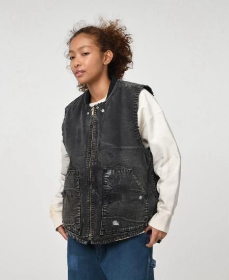 厚手のコットンダック地に中綿を仕込み、耐久性と防寒性を兼ね備えたダックベストは、80 年代からアメリカのワーカーたちの冬の相棒として長く愛されてきた。屋外での建設、運送、農作業など過酷な現場において、動きやすさと保温性を両立するその機能性は揺るぎない評価を得ている。本作は、そんなワークウェアの DNA をベースに BOW WOW が再構築。アメリカンワークの象徴的素材であるヘビーオンスのダック生地を採用し、経年変化で生まれるアタリやフェード、破れを加工で再現。裏地には保温性を高める中綿キルティングを仕込み、現代的なフィッティングでタウンユースへと引き寄せた。無骨さと都会的な洗練を併せ持つ一着は、ワークシーンだけでなく街中でも存在感を放つ。伝統的ワークアイテムに新たな息吹を与えた。