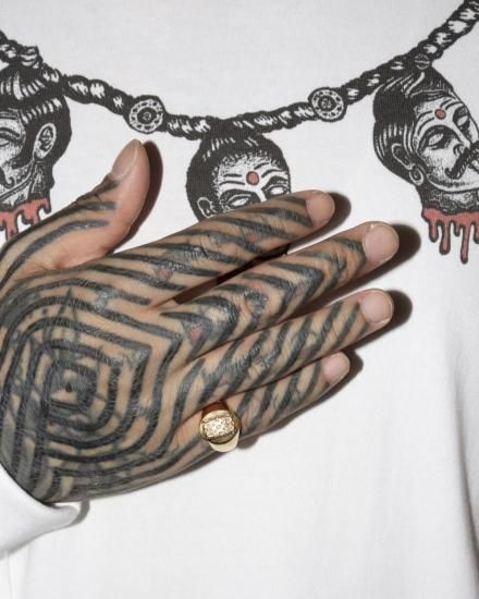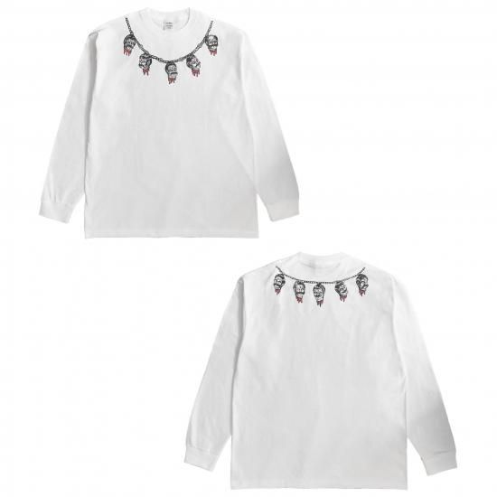 丸胴ボディーを使用したカーリー・マーのネックレスプリントのロングスリーブTシャツ。