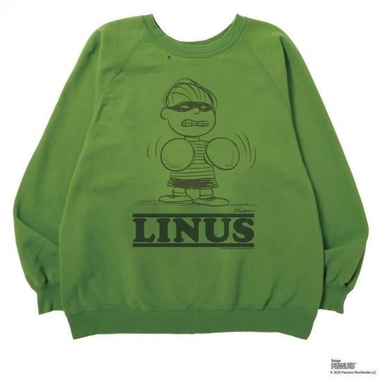 USAコットンのオリジナル丸胴生地を使用し、ヴィンテージのBEETHOVENやSNOOPYシリーズのボディになっているSPRUCE社製のスウェットの縫製方法を踏襲し、ヴィンテージのスヌーピーシリーズでは展開されなかった珍しいライナスをフューチャーしました。全体にヴィンテージ加工を施したPEANUTS社のオフィシャルコラボレーションスウェットです。